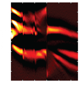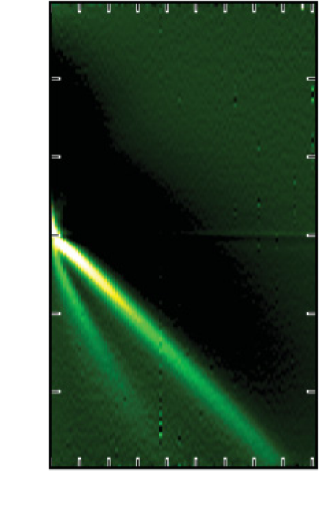 Two bright features (they look like green diagonal lines) appear in the figure on the right. The upper feature corresponds to the band-edge of a 2D electron system. The lower feature exists below the band-edge, and this feature is the long elusive “plasmaron”.