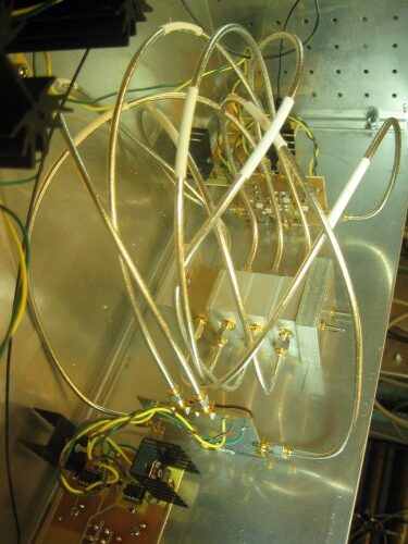 Although this looks like a 3D map of a highway interchange, it’s actually the interior of our “pulse shaper”. This home-built device takes electrical pulses generated by commercial pulse generators, which typically “ring,” or wiggle around, and turns them into the nearly perfectly flat pulses we need for this experiment.