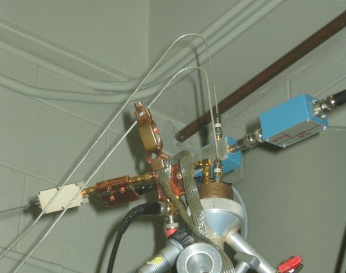 Here, you can see the place where some of our wiring enters the cryostat. Notice the smooth curves once again in the thick, silver colored wires (they’re called semi-rigid coaxial cables) as they enter. The white-banded cylinders they’re attached to at the top of the stick are called attenuators; they make signals smaller. Not only do they help us by making the noise generated by our signal generators less important, but they help with reflections. We cannot afford to absorb the radio-frequency pulses we send down into our cryostat; the energy involved would heat up our fridge. Instead, we let most of the power reflect back out of the cryostat. Normally this would be a problem, because some of that power would reflect back off our signal generator (it isn’t perfect), and we’d see it hit our sample again in about twice the time it takes light to travel down the length of our cables. That’s a long time in our experiment; we need to have completed our entire measurement in about 100 nanoseconds, around the amount of time it takes light to travel to first base from home plate on a baseball field. However, each time the signal travels through the attenuator, it’s made smaller; this reflection has passed through these attenuators two extra times on the way back to the sample, so it’s small enough we can ignore it.